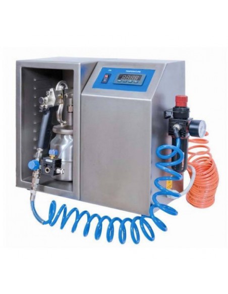 Máquina para rociar chocolate, gracias a la posibilidad de regular la presión, la cantidad de chocolate y el ángulo de la boquilla, permite realizar efectos decorativos especiales: terciopelo, nieve, granulado, piel de naranja, puntos, líneas, etc.