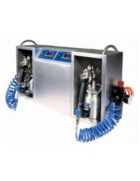 La solución ideal para rociar chocolate en tortas, moldes de chocolate, praliné, y para obtener en pocos minutos productos decorados perfectamente y con un aspecto atractivo. La rociadora de chocolate es una máquina formada por una pistola para rociar chocolate y una estructura que puede calentarse en la cual ubicar la pistola al finalizar la elaboración. A pedido se suministra el compresor.