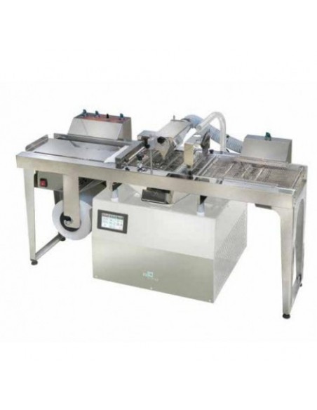 Bañadora PARCIAL CHOCO TOP 11 . En espacios reducidos, se encuentran una zona de carga; una zona de cobertura con soplador, vibración y acabador; una zona de descarga con bandeja removible. Dos accesorios disponibles para bañado parcial y bañado de la parte inferior del producto.